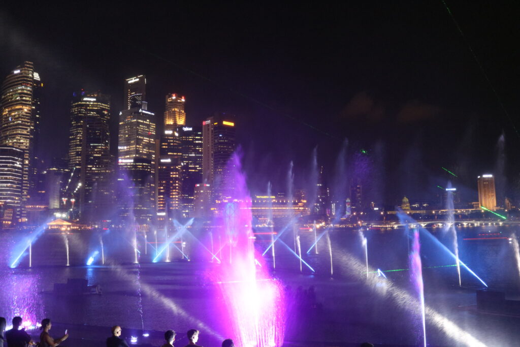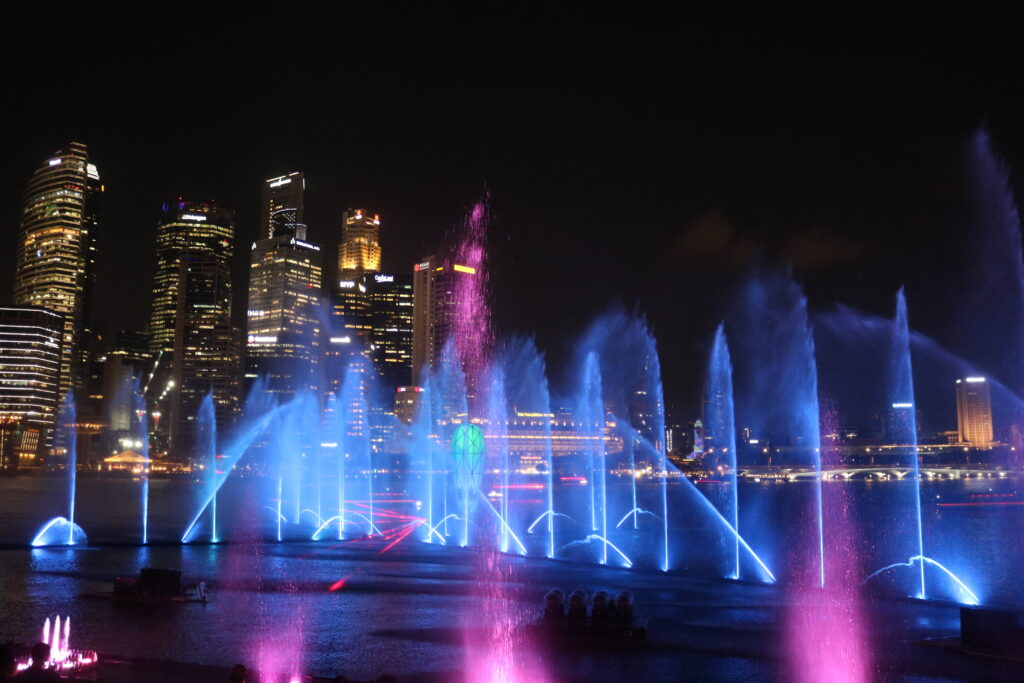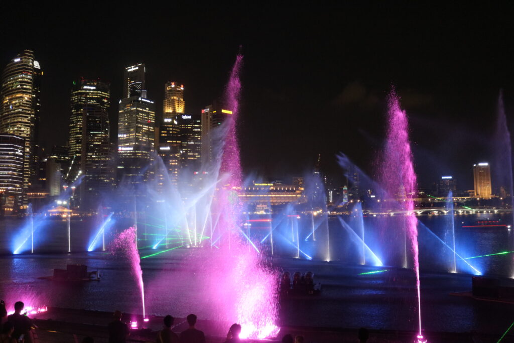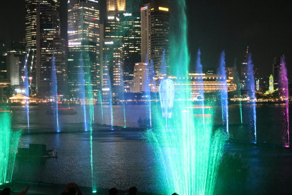 マリーナベイサンズの北西側、マーライオンが見える方向で行われる噴水ショーは、完全無料で楽しめます。