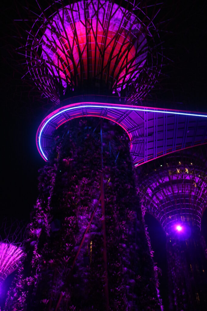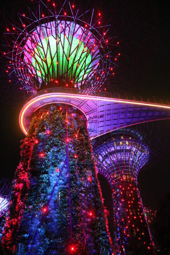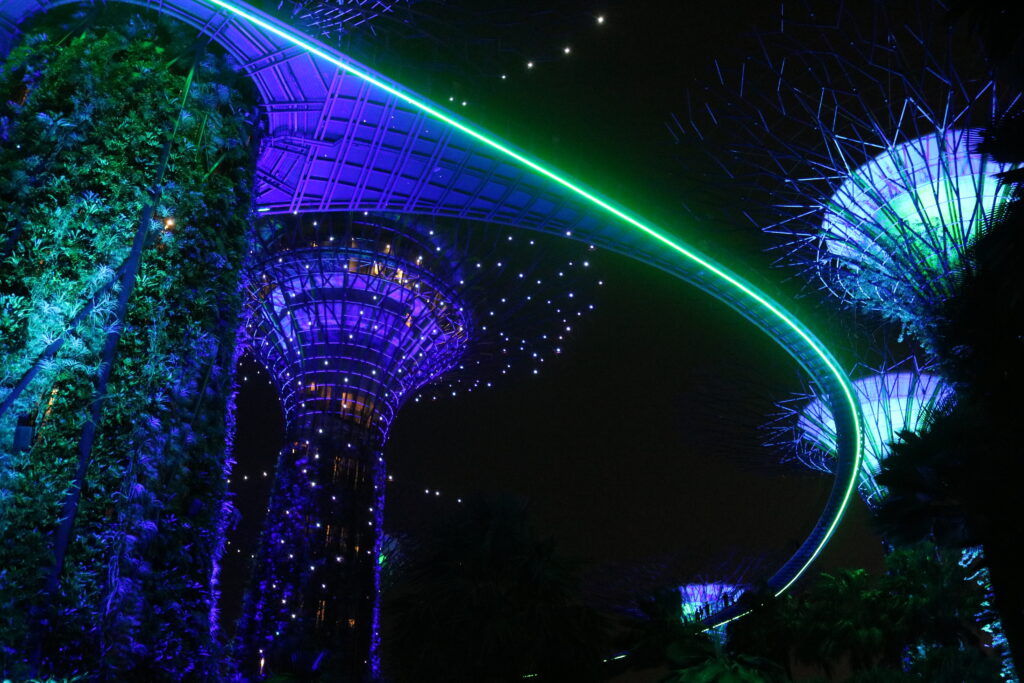 ガーデンズ・バイ・ザ・ベイで行われるライトアップショーは、音楽に合わせて巨大なツリーが光る幻想的な無料イベント。